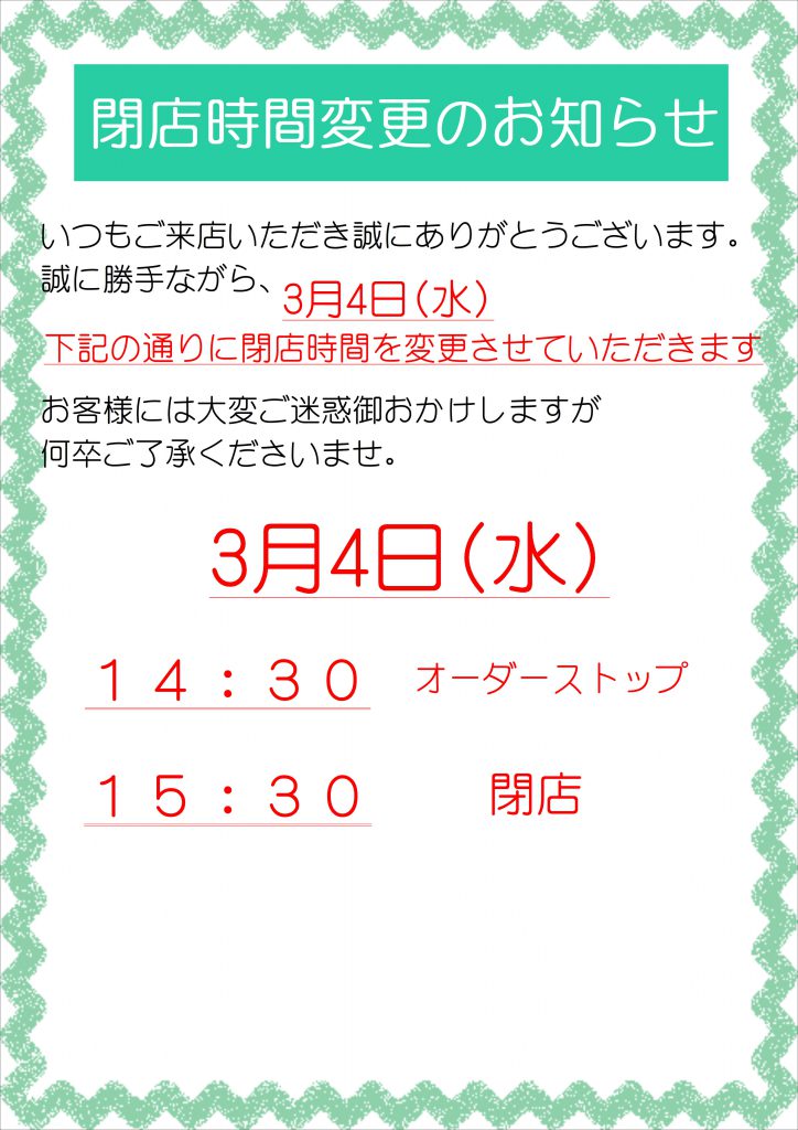 3/4(水)閉店時間臨時変更のお知らせ