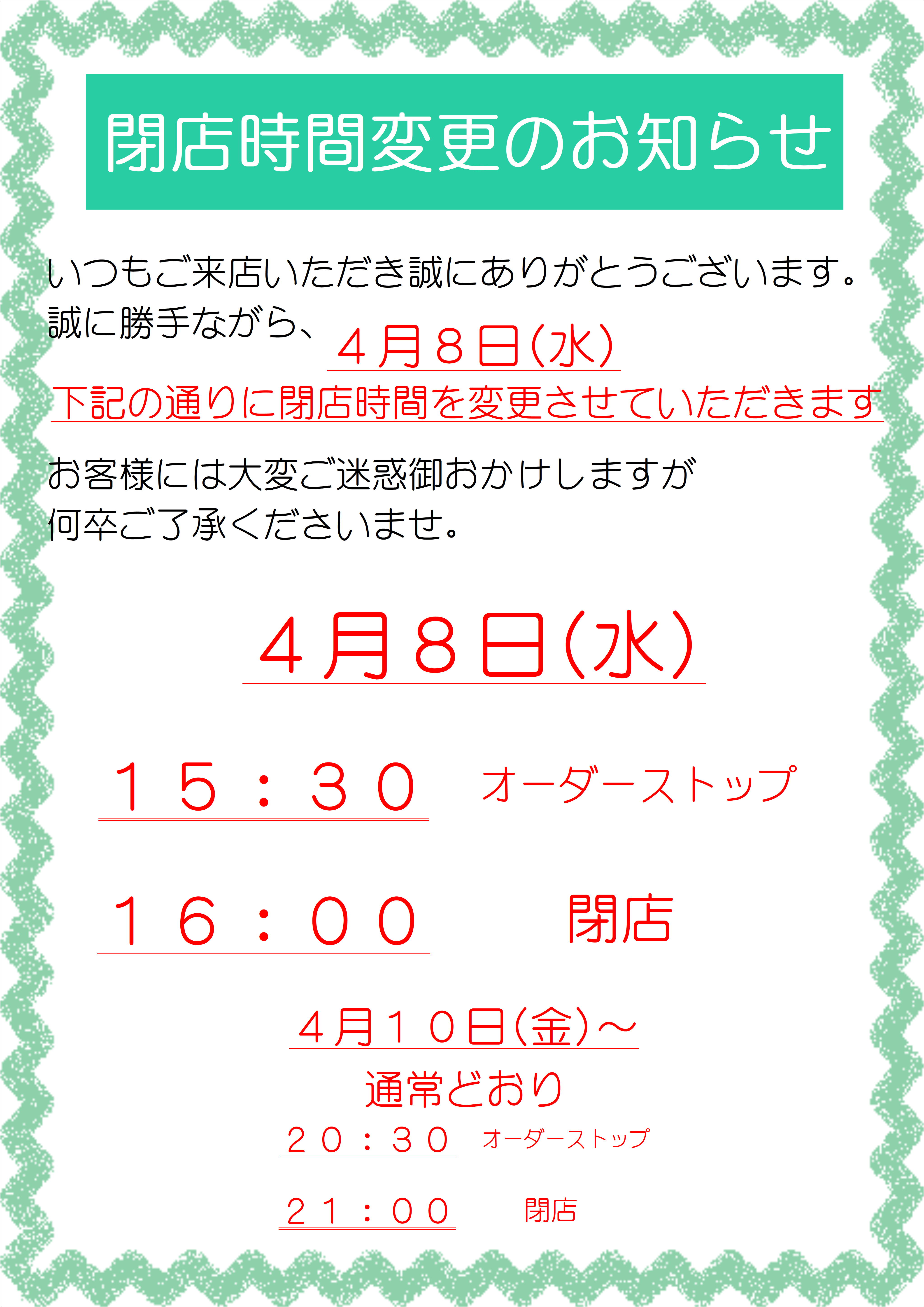 4/8(水) 閉店時間変更のお知らせ